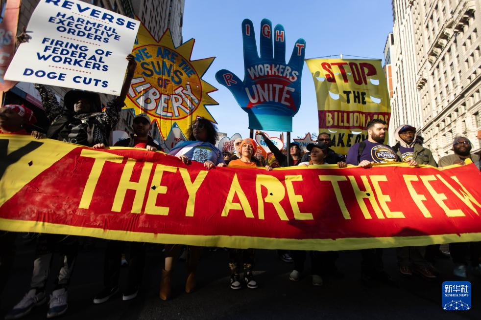5月1日,人們手持標語在美國紐約參加抗議特朗普政府政策的集會和游行。新華社發(fā)(郭克攝)