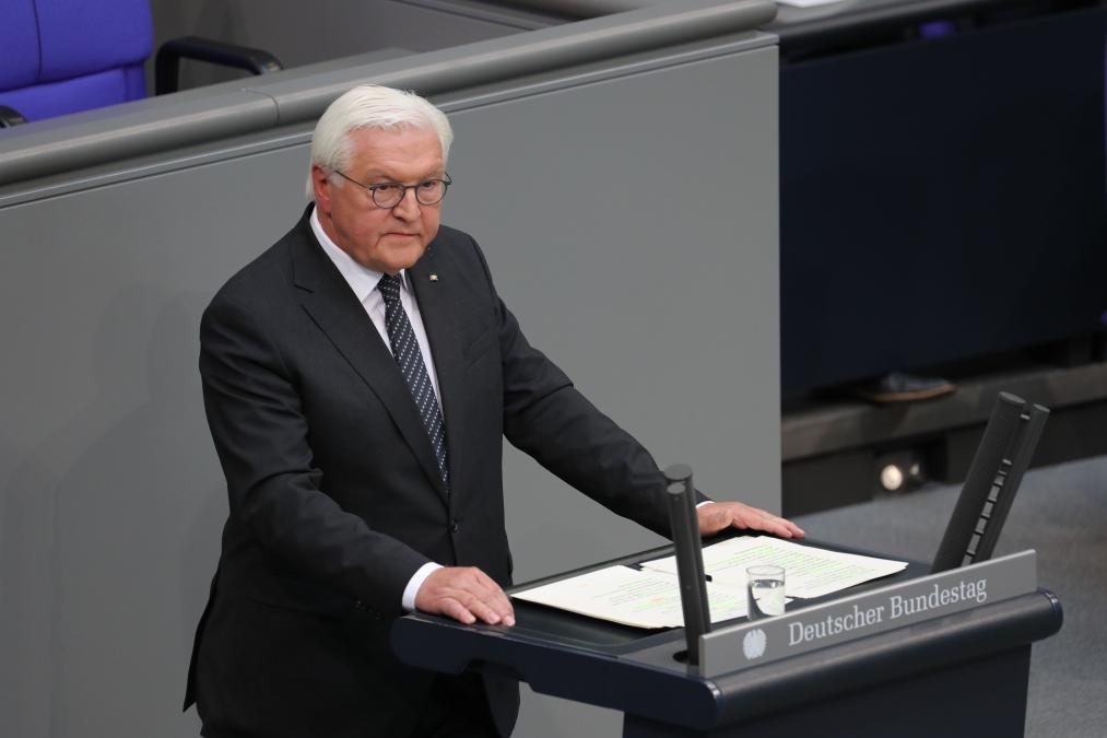 5月8日,德國總統施泰因邁爾在首都柏林國會大廈舉行的紀念活動上致辭。新華社記者杜哲宇攝