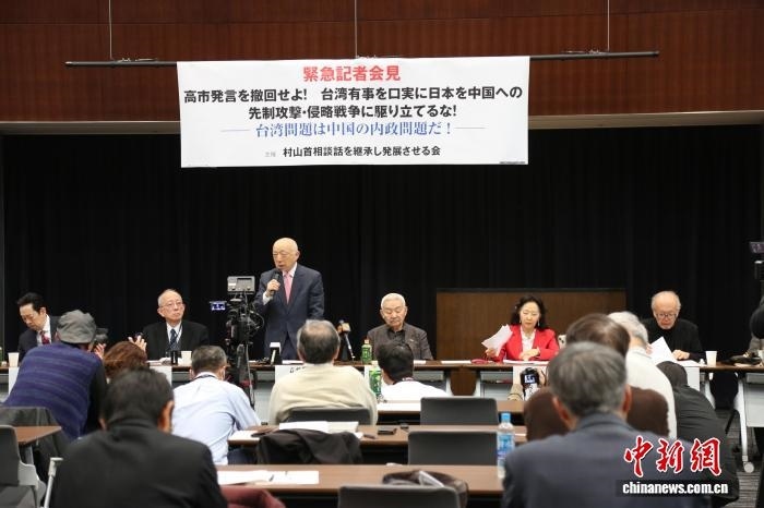 12月8日,日本多名學(xué)者及市民團(tuán)體代表在位于東京的日本參議院議員會(huì)館舉行記者會(huì),要求日本首相高市早苗撤回涉臺錯(cuò)誤言論。圖為“繼承和發(fā)展村山談話會(huì)”理事長藤田高景發(fā)言。中新社記者 朱晨曦 攝