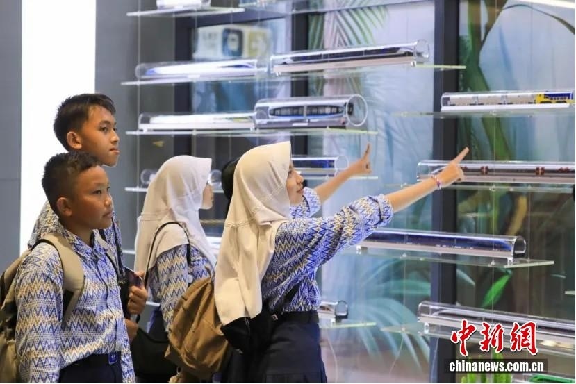 當(dāng)?shù)貢r(shí)間2024年10月17日,一群印尼學(xué)生在印尼雅加達(dá)的雅萬(wàn)高鐵動(dòng)車(chē)組科普文化交流基地參觀。 中新社記者 李志全 攝