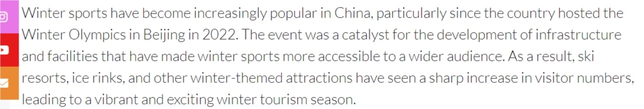 文章說,自2022年北京冬奧會成功舉辦以來,冰雪運動在中國越來越受歡迎。冬奧效應(yīng)帶動了基礎(chǔ)設(shè)施的完善,讓更多人得以接觸冰雪項目。如今,滑雪場、冰場和其他冬季主題景點客流量大幅增長,造就了充滿活力、令人興奮的冰雪旅游季。