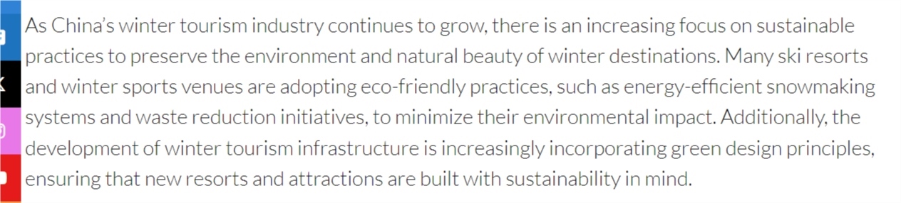 文章還說,隨著中國冬季旅游產(chǎn)業(yè)的不斷壯大,可持續(xù)發(fā)展理念、環(huán)保實踐也日益受到重視。中國正成為越來越有吸引力的冬季旅游目的地。