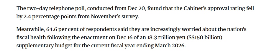 報道指出,目前進口化石燃料占日本發(fā)電量的60%-70%,是推高通脹的主要因素之一,也已影響自民黨支持率。而日本共同社21日公布的最新民調(diào)顯示,高市早苗內(nèi)閣支持率較11月的調(diào)查下降了2.4個百分點,有64.6%的受訪者表示,隨著本月16日2025財年追加預(yù)算案的通過,他們對國家財政狀況的擔(dān)憂日益加劇。
