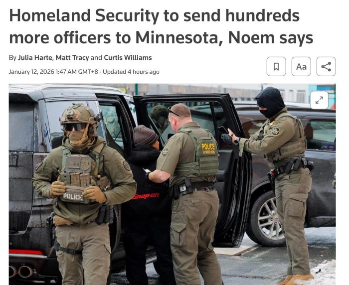 中新網(wǎng)1月12日電 綜合路透社等外媒報(bào)道,當(dāng)?shù)貢r(shí)間11日,美國國土安全部部長諾姆表示,國土安全部將向明尼蘇達(dá)州增派“數(shù)百名”警員。