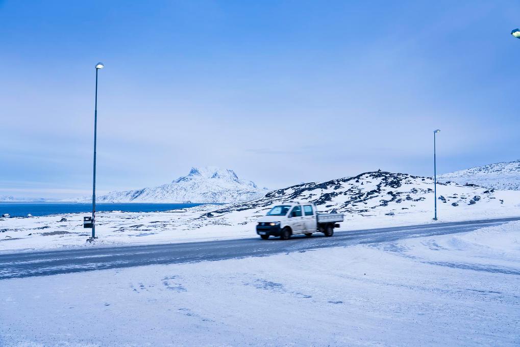 1月16日,一輛汽車(chē)行駛在丹麥自治領(lǐng)地格陵蘭島首府努克市郊。新華社發(fā)(安德斯·孔斯豪格攝)
