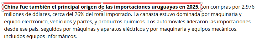 2025年,中國繼續(xù)保持烏拉圭第一大出口市場地位。根據(jù)烏拉圭二十一世紀(jì)投資和出口促進局發(fā)布的年度外貿(mào)報告,2025年烏拉圭對華出口額達(dá)到34.93億美元,占烏拉圭出口總額的26%,較2024年增長約12%。