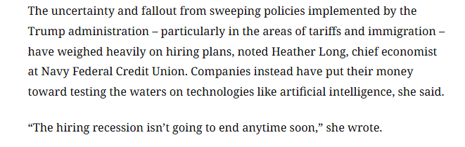 報道還援引美國海軍聯(lián)邦信用合作社(Navy Federal Credit Union)首席經(jīng)濟學(xué)家希瑟·朗的觀點稱,特朗普政府推行的一系列政策,尤其是關(guān)稅和移民政策,所帶來的不確定性及后果對招聘計劃造成了沉重影響。希瑟·朗認為,招聘市場的低迷狀況短期內(nèi)不會結(jié)束。