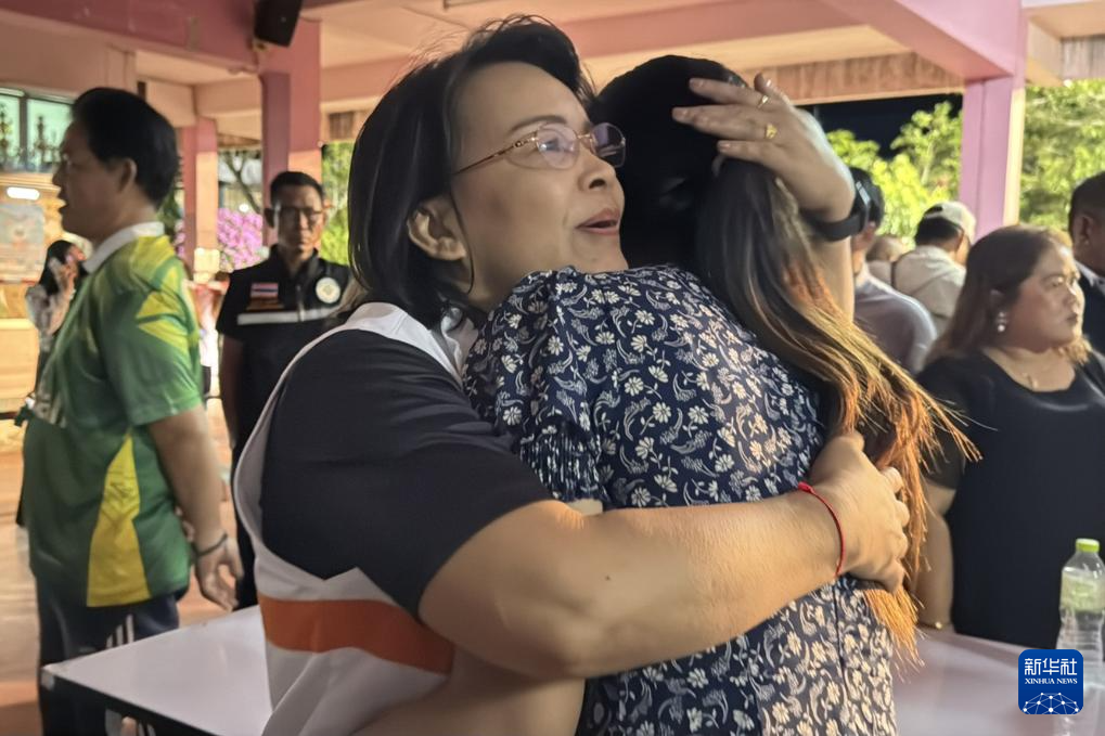 2月11日,兩名女子在泰國宋卡府合艾縣發(fā)生校園槍擊案的學(xué)校互相擁抱。新華社發(fā)