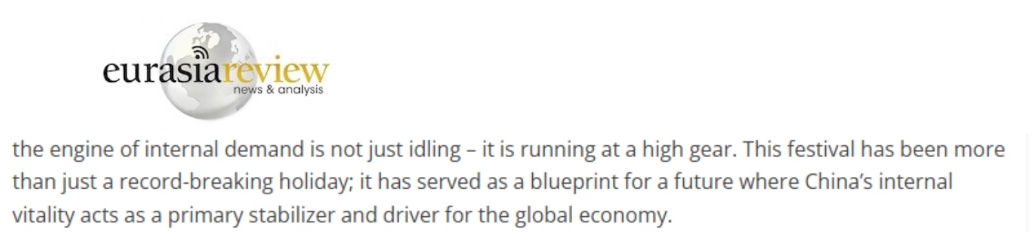 文章最后說,春節(jié)消費(fèi)熱潮表明,內(nèi)需引擎非但沒有空轉(zhuǎn),反而在高速運(yùn)轉(zhuǎn)。這個(gè)春節(jié)的意義不僅僅在于其破紀(jì)錄的假期數(shù)據(jù),而是在于它繪制了一幅未來藍(lán)圖:中國(guó)的內(nèi)在活力將成為全球經(jīng)濟(jì)的主要穩(wěn)定器和驅(qū)動(dòng)力。