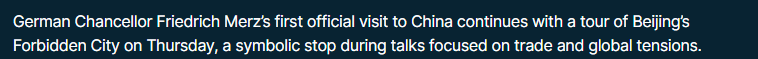 歐洲新聞電視臺(tái)26日?qǐng)?bào)道稱,在經(jīng)濟(jì)緊張局勢(shì)加劇的背景下,德國正努力尋求更平衡的貿(mào)易關(guān)系。默茨此次訪問期間的一個(gè)具有象征意義的環(huán)節(jié)就是參觀故宮。報(bào)道稱,默茨表示,德國乃至歐洲希望與中國建立一種平衡且可靠的伙伴關(guān)系。