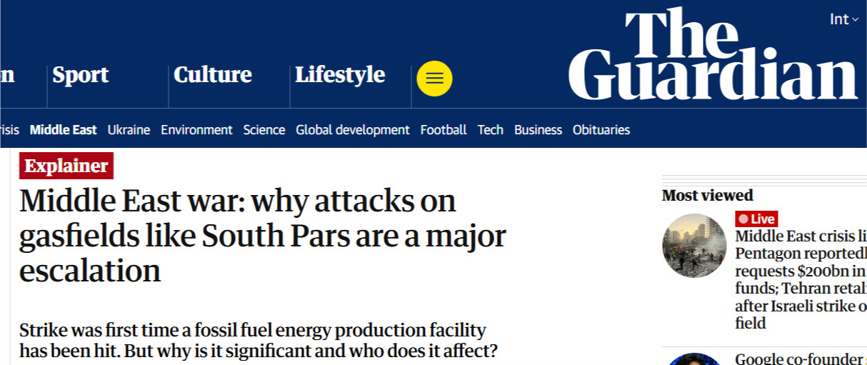 在以色列空軍當(dāng)?shù)貢r間3月18日襲擊了位于伊朗南部布什爾市的伊朗“主要天然氣設(shè)施”后,19日,伊朗方面表示已發(fā)動“真實承諾-4”行動第63波攻勢,“焚毀”與美國相關(guān)的石油設(shè)施作為報復(fù)。相關(guān)聲明稱,伊朗同美國和以色列的戰(zhàn)爭已進入“新階段”。多家外媒指出,這是美以發(fā)動對伊軍事打擊以來,首次襲擊伊朗在海灣的能源生產(chǎn)設(shè)施,標(biāo)志著戰(zhàn)爭的“重大升級”。