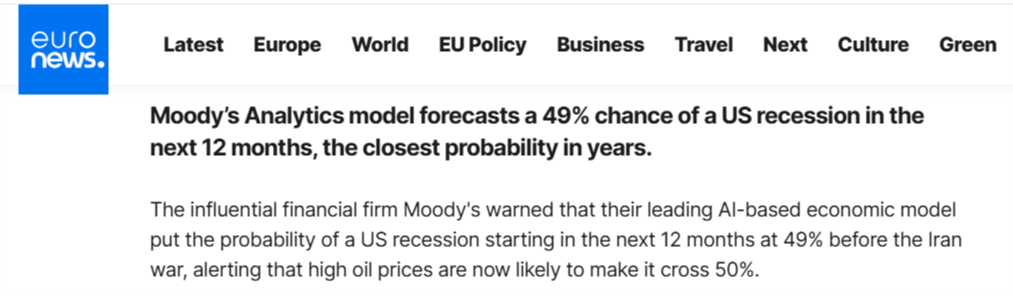 美政府接連出手的背后是疲軟的經(jīng)濟與通脹的預(yù)期無法承受高油價。而放任針對能源基礎(chǔ)設(shè)施的襲擊將進一步威脅全球能源供應(yīng),推高油價。目前美國汽油價格已飆升至自2023年以來的最高水平,而據(jù)歐洲新聞臺3月18日報道,穆迪分析(Moody's Analytics)模型預(yù)測,未來12個月內(nèi)美國經(jīng)濟陷入衰退的概率為49%,這是多年來最接近臨界點的一次。該模型還提醒稱,當(dāng)前高企的油價很可能使這一概率突破50%。