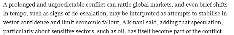 一名研究中東地區(qū)的金融分析師澤頓·阿爾基納尼(Zeidon Alkinani)告訴半島電視臺,曠日持久且難以預(yù)測的沖突會動搖全球金融市場的信心,即使是短暫的節(jié)奏變化,例如局勢緩和的跡象,也可能被解讀為試圖穩(wěn)定投資者信心和限制經(jīng)濟損失。阿爾基納尼強調(diào),“投機行為,特別是對石油等敏感行業(yè)的投機行為,本身也已成為沖突的一部分。”