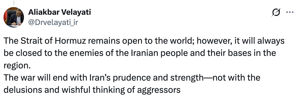 當(dāng)?shù)貢r(shí)間4月2日,伊朗最高領(lǐng)袖外事顧問、前外長韋拉亞提在其個(gè)人社交媒體平臺(tái)賬號(hào)上表示,霍爾木茲海峽對(duì)世界開放,但對(duì)伊朗人民的敵人及其在該地區(qū)的據(jù)點(diǎn)將永遠(yuǎn)關(guān)閉。