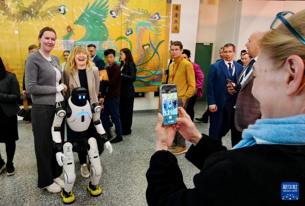 4月13日,在奧地利維也納國(guó)際中心,人們?cè)谝浴疤统錆M——在維也納聯(lián)合國(guó)遇見故宮”為主題的2026年維也納聯(lián)合國(guó)中文日系列活動(dòng)上與機(jī)器人合影。 新華社發(fā)(王宙攝)