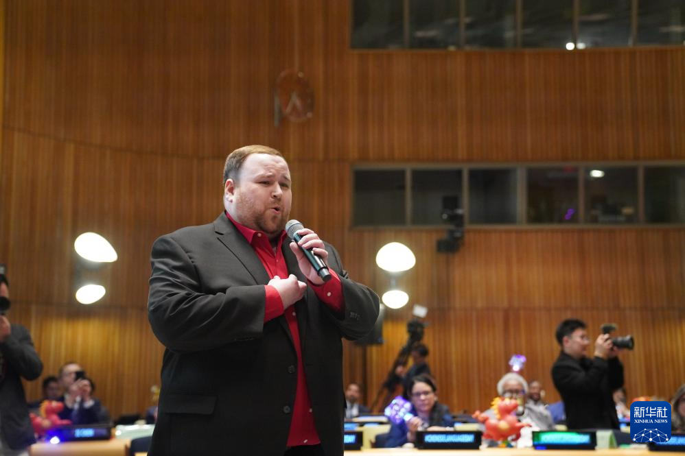 4月13日,在位于紐約的聯(lián)合國(guó)總部,美國(guó)歌唱家在聯(lián)合國(guó)中文日慶?;顒?dòng)上演唱《我愛你中國(guó)》。 新華社記者 張鳳國(guó) 攝
