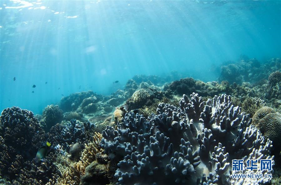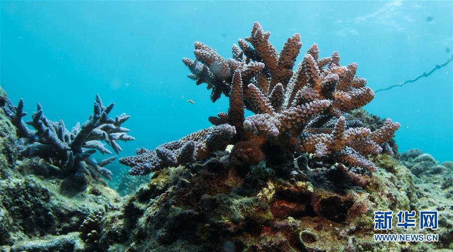 這是海南三亞蜈支洲島海域海洋牧場內(nèi)生長的珊瑚(4月28日攝)。新華社記者楊冠宇攝