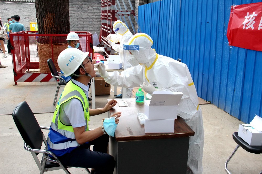 6月15日至17日,中建三局北京公司在京1042名職工做完核酸檢測,同時(shí)公司邀請(qǐng)專業(yè)機(jī)構(gòu)為在建項(xiàng)目的上萬名勞務(wù)工人、安保及物業(yè)管理人員提供上門核酸檢測。新華社發(fā)(柯玉乾攝)