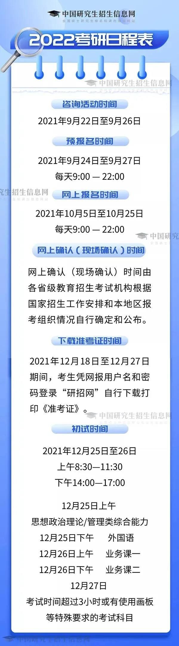 根據(jù)《2022年全國(guó)碩士研究生招生工作管理規(guī)定》,2022年研考網(wǎng)上報(bào)名時(shí)間為2021年10月5日至10月25日。網(wǎng)上預(yù)報(bào)名時(shí)間為2021年9月24日至9月27日。