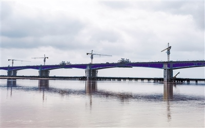 10月5日凌晨,由內(nèi)蒙古高路公司投資,中交二公局承建,包茂高速公路昭君黃河特大橋主橋雙幅順利合龍。昭君黃河特大橋橫亙于黃河,氣勢宏偉,蔚為壯觀,大橋采用雙向4車道高速公路標(biāo)準(zhǔn)建設(shè),全長4300米,分北岸灘橋、北岸跨堤橋、主橋、南岸灘橋、南岸跨堤橋五部分。(王曉博 攝)