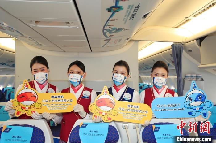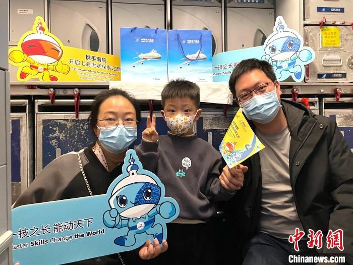 參加全球首架世界技能大賽主題彩繪飛機首航的乘客在機上留影 南方航空供圖