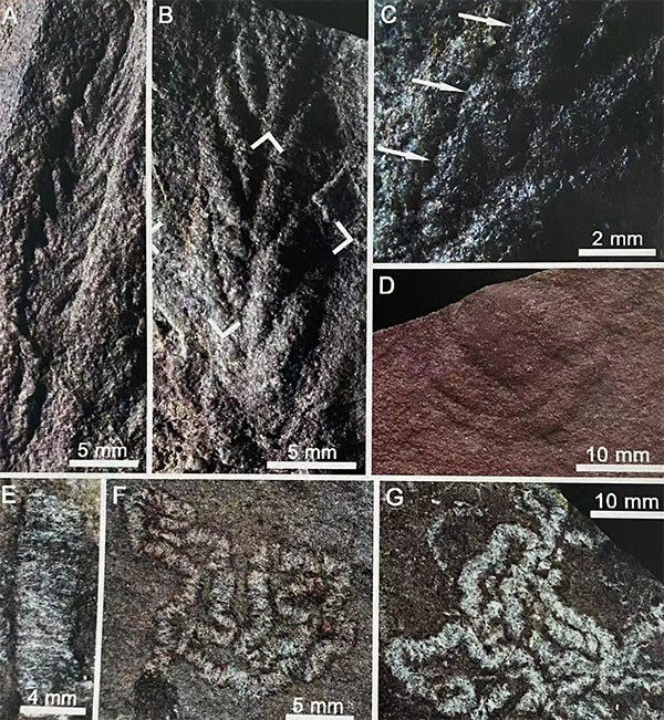 圖為全吉山生物群的代表性埃迪卡拉化石恰尼蟲(A-C)、盾盤蟲(D)和陜西跡(E-G)