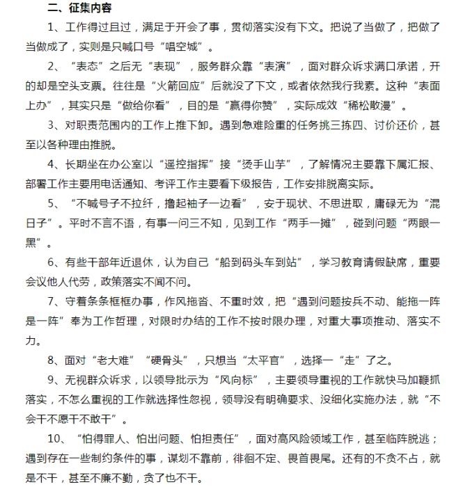 “躺平式干部”線索的征集包括10個(gè)方面,例如,“工作得過且過,滿足于開會了事”,“‘表態(tài)’之后無‘表現(xiàn)’,服務(wù)群眾靠‘表演’”,“平時(shí)不言不語,有事一問三不知”,等等。