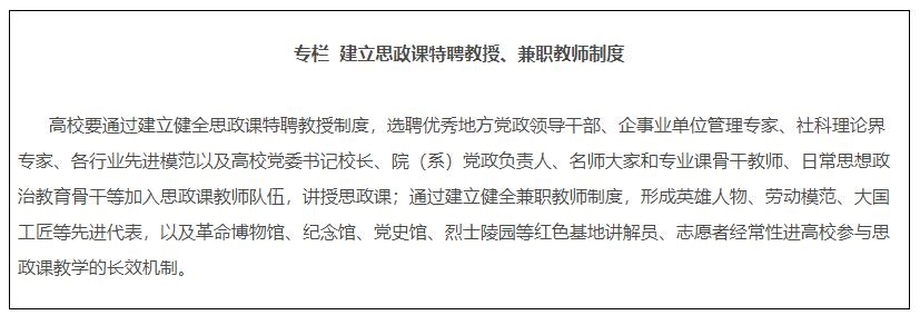 14.建設專兼結合的師資隊伍。各地各校嚴格按照要求配備建強高校專職思政課教師、輔導員隊伍,提高中小學專職思政課教師比例,實行思政課特聘教授、兼職教師制度,積極聘請黨政領導、科學家、老同志、先進模范等擔任思政課兼職教師。深入實施馬克思主義學院院長(書記)培養(yǎng)工程,通過集中培養(yǎng)培訓、委托重大項目、加強實踐鍛煉、開展國際國內(nèi)訪學等方式,培養(yǎng)一批青年馬克思主義理論家。