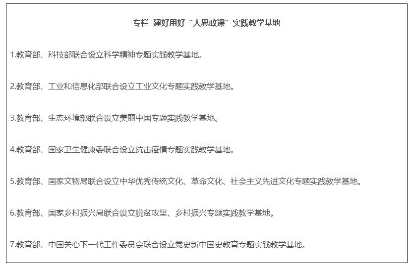 10.建好用好實踐教學基地。教育部會同有關部門,利用現(xiàn)有基地(場館),分專題設立一批“大思政課”實踐教學基地。發(fā)揮好教育部高校思政課教師研學基地的實踐教學功能。各地教育部門要結合實際,積極建設“大思政課”實踐教學基地。大中小學要主動對接各級各類實踐教學基地,開發(fā)現(xiàn)場教學專題,開展實踐教學。有條件的學校可與有關基地建立長效合作機制,加強研究和資源開發(fā)。各基地要積極創(chuàng)造條件,與各地教育部門、學校建立有效工作機制,協(xié)同完成好實踐教學任務。