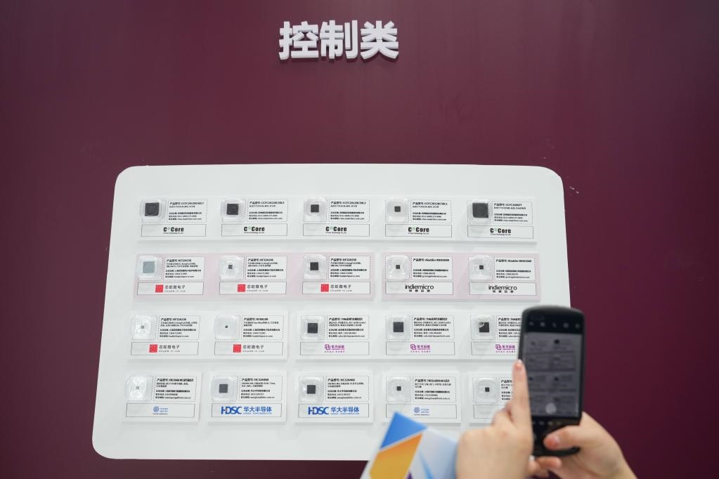 8月26日,一位參觀者在拍攝展出的車用芯片。當日,2022世界新能源汽車大會在北京、海南兩地以線上、線下相結合的方式召開。新華社記者鞠煥宗攝