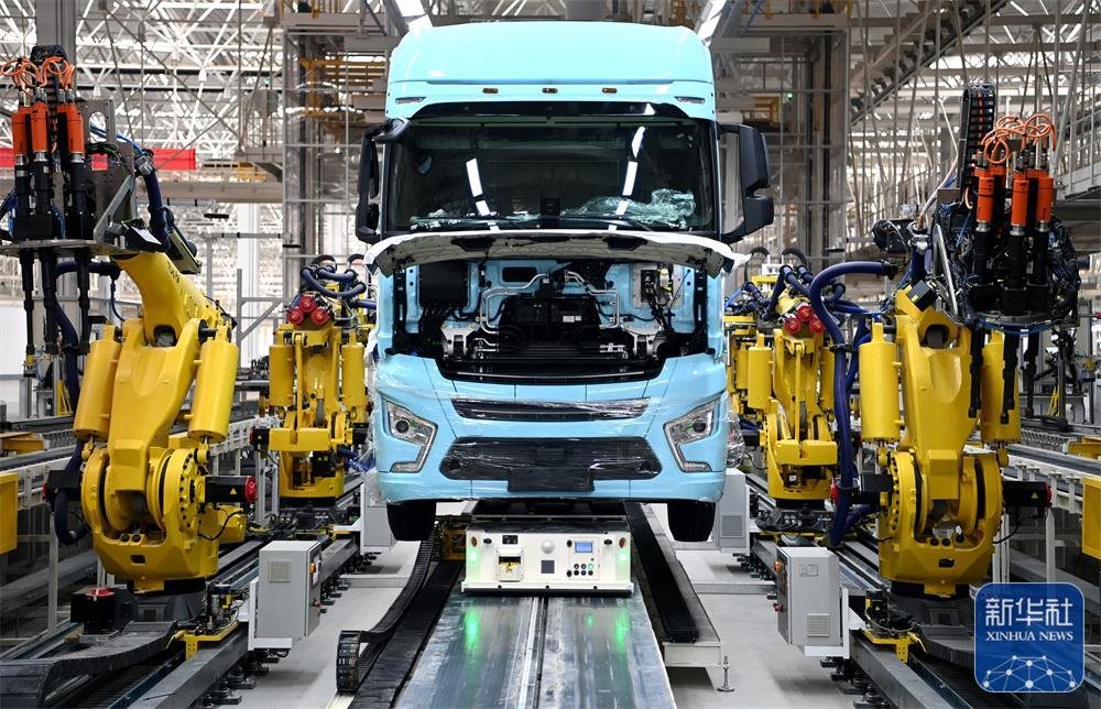在陜汽重卡擴能項目現(xiàn)場,一輛重卡在汽車總裝生產(chǎn)線輪胎自動化裝配擰緊無人工作站進行裝配(9月27日攝)。新華社記者 劉瀟 攝