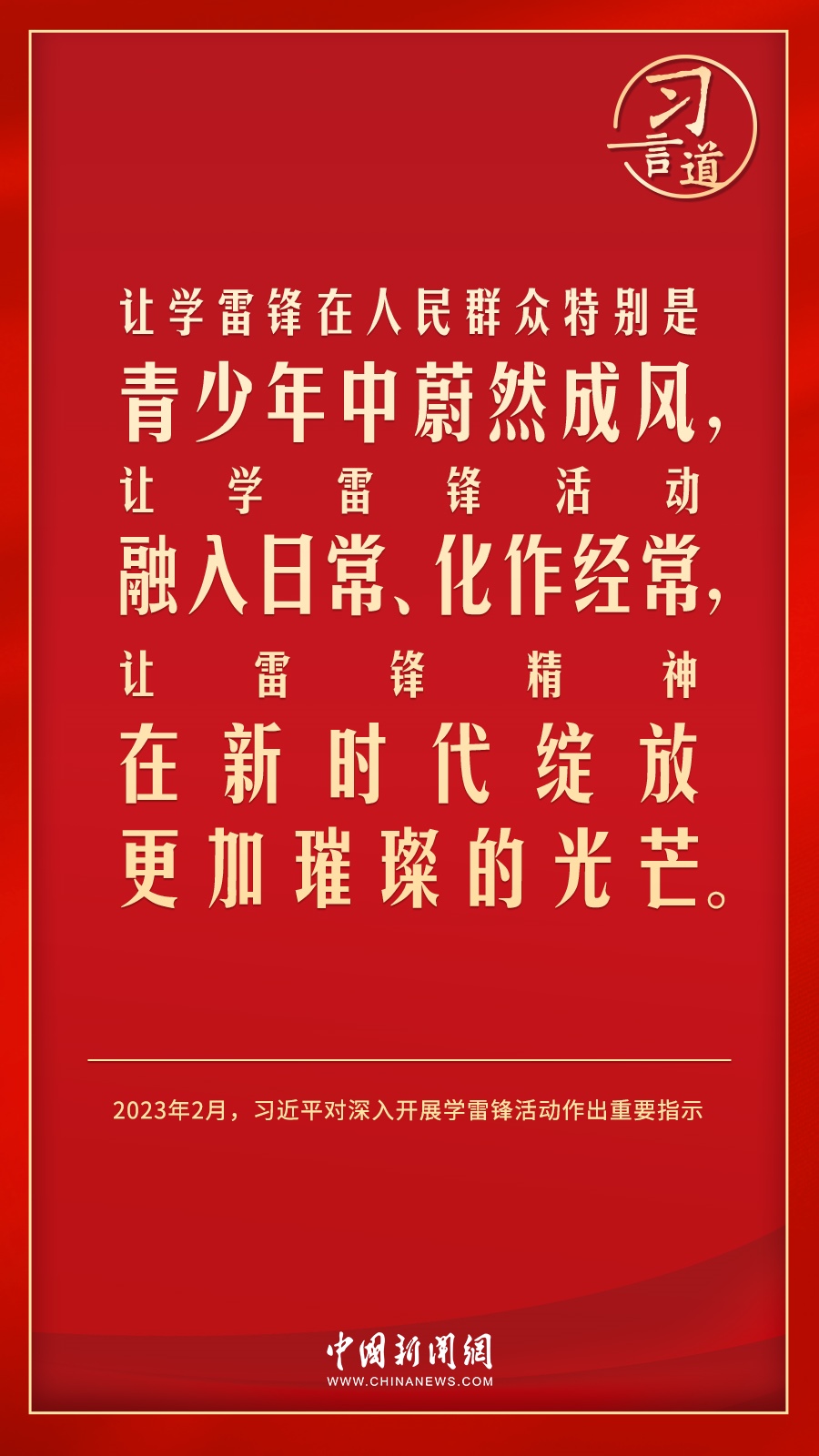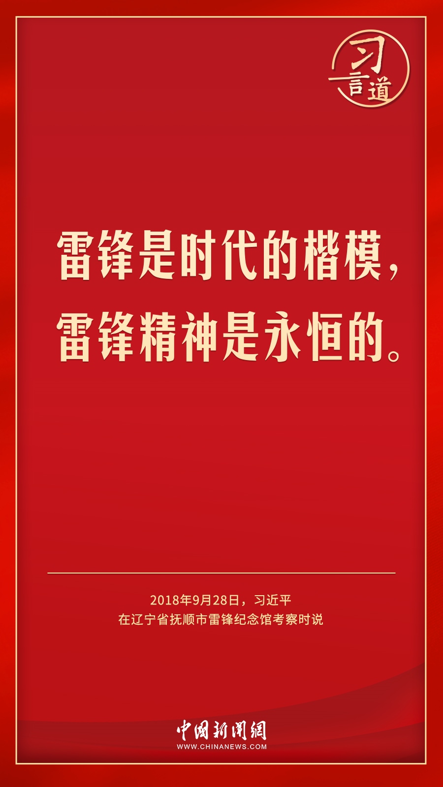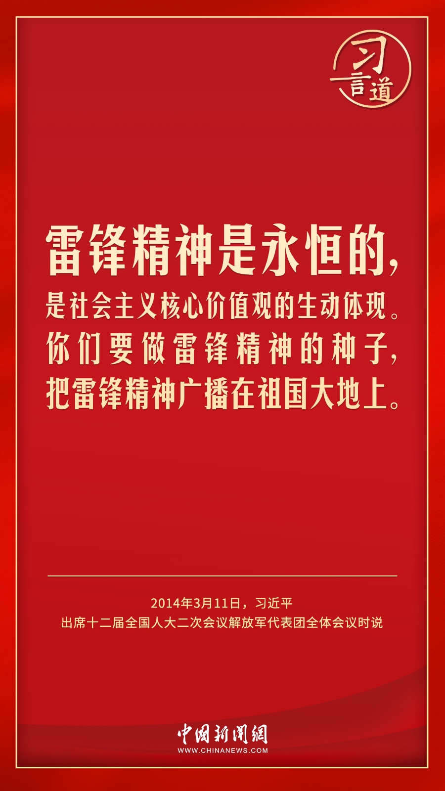 今年是毛澤東等老一輩革命家為雷鋒同志題詞60周年。黨的十八大以來(lái),習(xí)近平總書記就學(xué)習(xí)弘揚(yáng)雷鋒精神多次作出重要指示,他強(qiáng)調(diào),無(wú)論時(shí)代如何變遷,雷鋒精神永不過(guò)時(shí)。