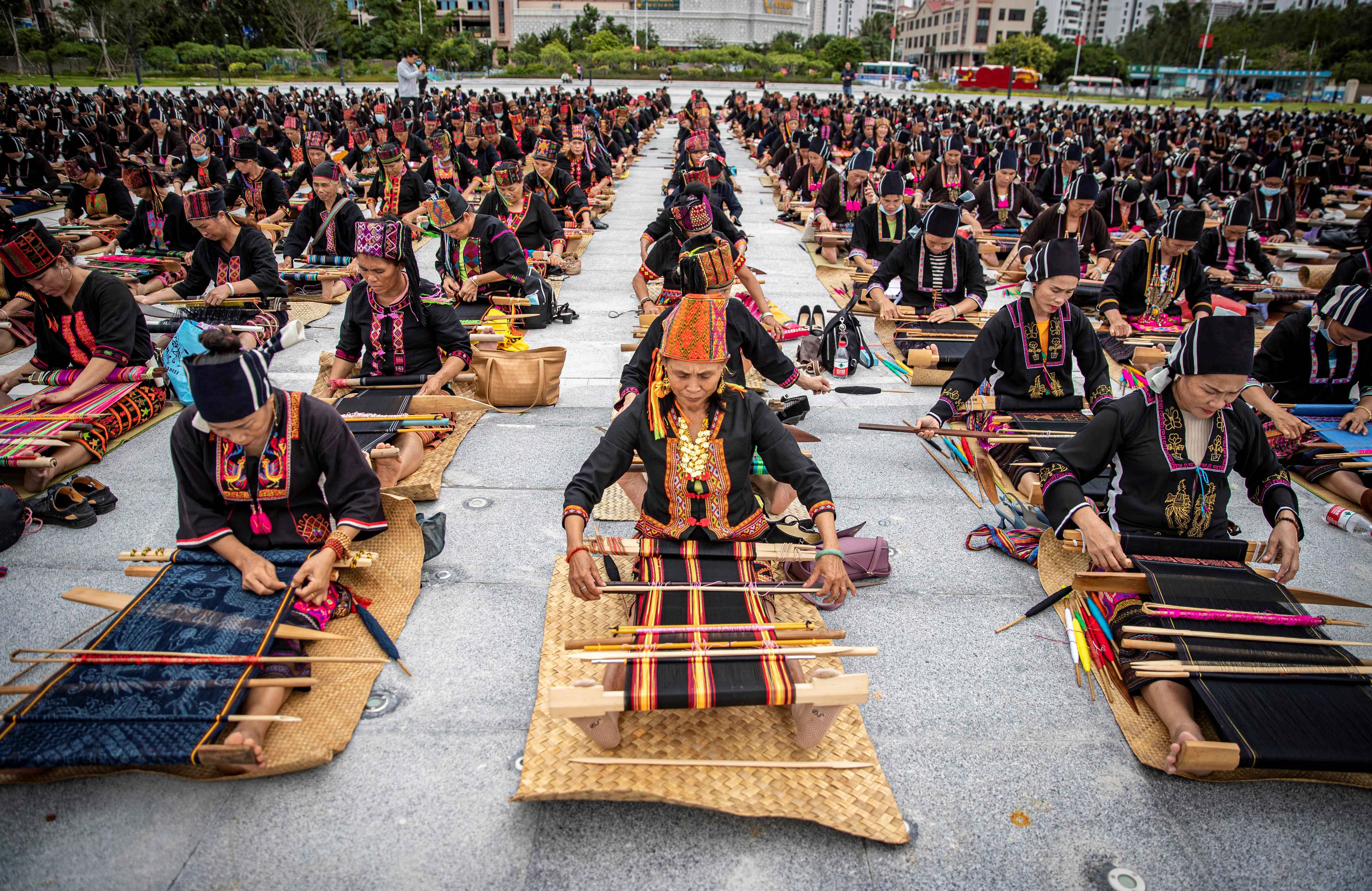 △2021年10月16日,海南東方文化廣場,千名身著傳統(tǒng)服裝的黎族婦女熟練織黎錦。