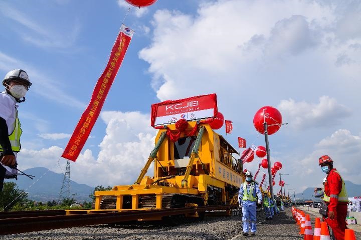△工作人員在印度尼西亞萬(wàn)隆雅萬(wàn)高鐵鋪軌施工現(xiàn)場(chǎng)作業(yè)(2022年4月20日攝)。