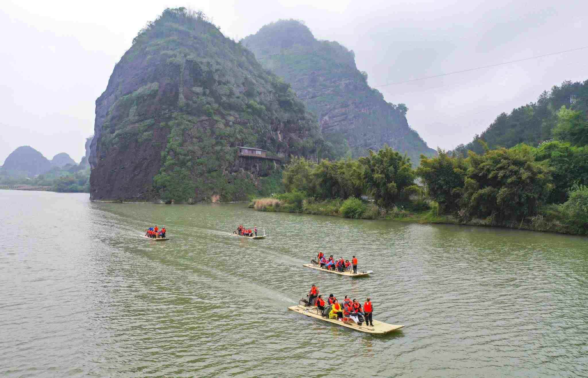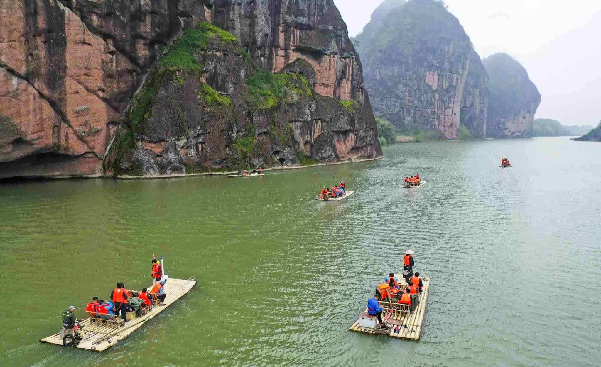 2023年4月13日,江西鷹潭,龍虎山景區(qū),游客們乘坐竹筏觀光賞景。視覺(jué)中國(guó)