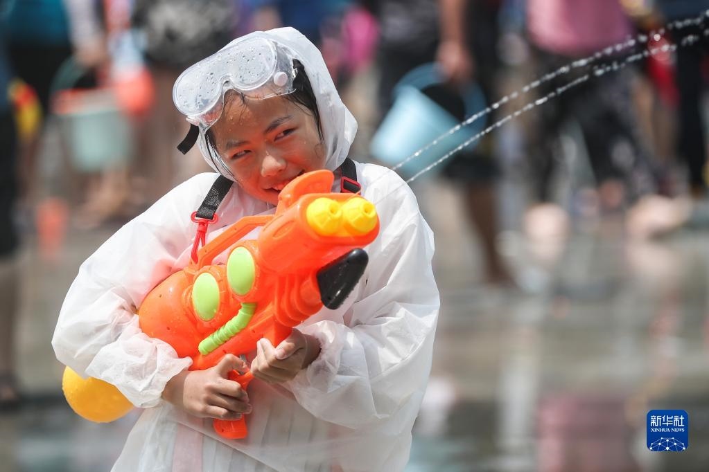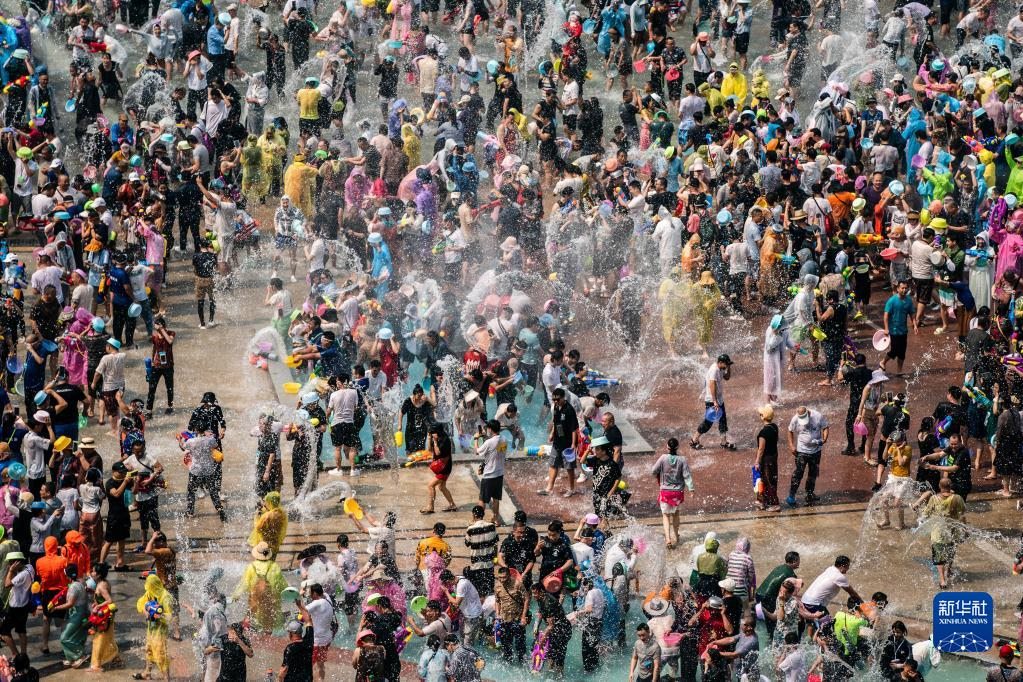4月15日,人們?cè)谠颇鲜∥麟p版納傣族自治州景洪市潑水廣場(chǎng)潑水狂歡。