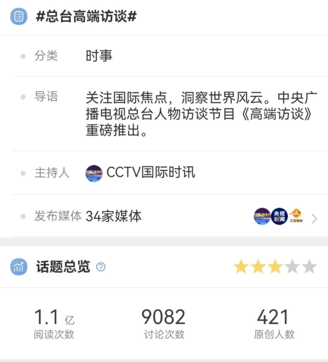 在充分調研的基礎上,《高端訪談》的采訪敢于碰真問題、硬問題,緊扣當下熱點,以觀點鮮明、針對性強、易于傳播的重磅采訪報道主動設置議題,奮力提升中國聲音在國際輿論場中的話語權。