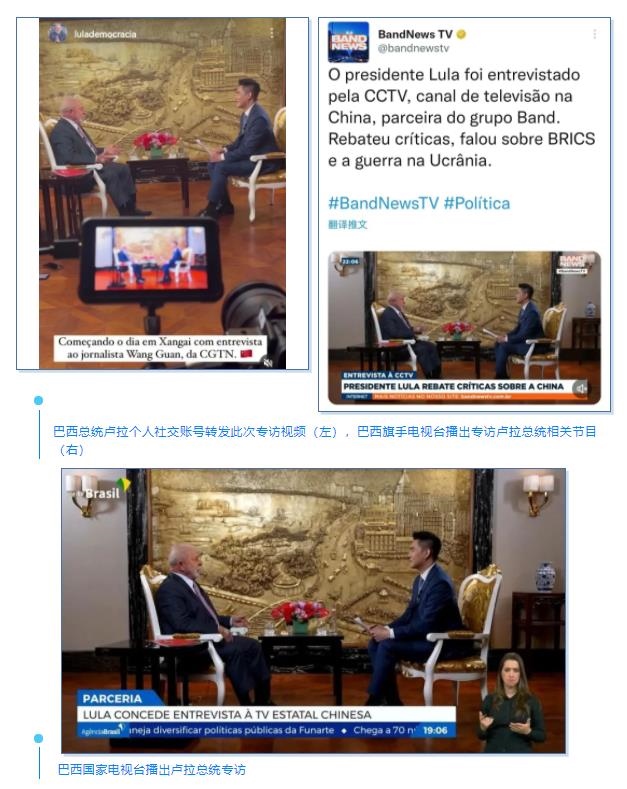 盧拉總統(tǒng)在其個人社交賬號轉發(fā)此次專訪視頻。巴西第二大電視臺旗手電視臺綜合頻道,在當?shù)貢r間4月14日晚率先播出總臺《高端訪談》專訪盧拉總統(tǒng)的精華版,觸達巴西全境,完整版專訪于次日在該臺各頻道多次播出。巴西最大新聞門戶網(wǎng)站UOL、知名雜志《論壇》等也陸續(xù)上線本次專訪節(jié)目。