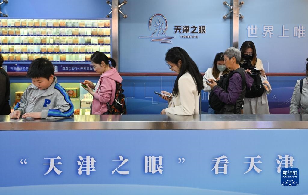 4月27日,游客在乘坐“天津之眼”摩天輪時(shí)觀看轎廂內(nèi)新設(shè)置的天屏播放的文旅宣傳視頻。