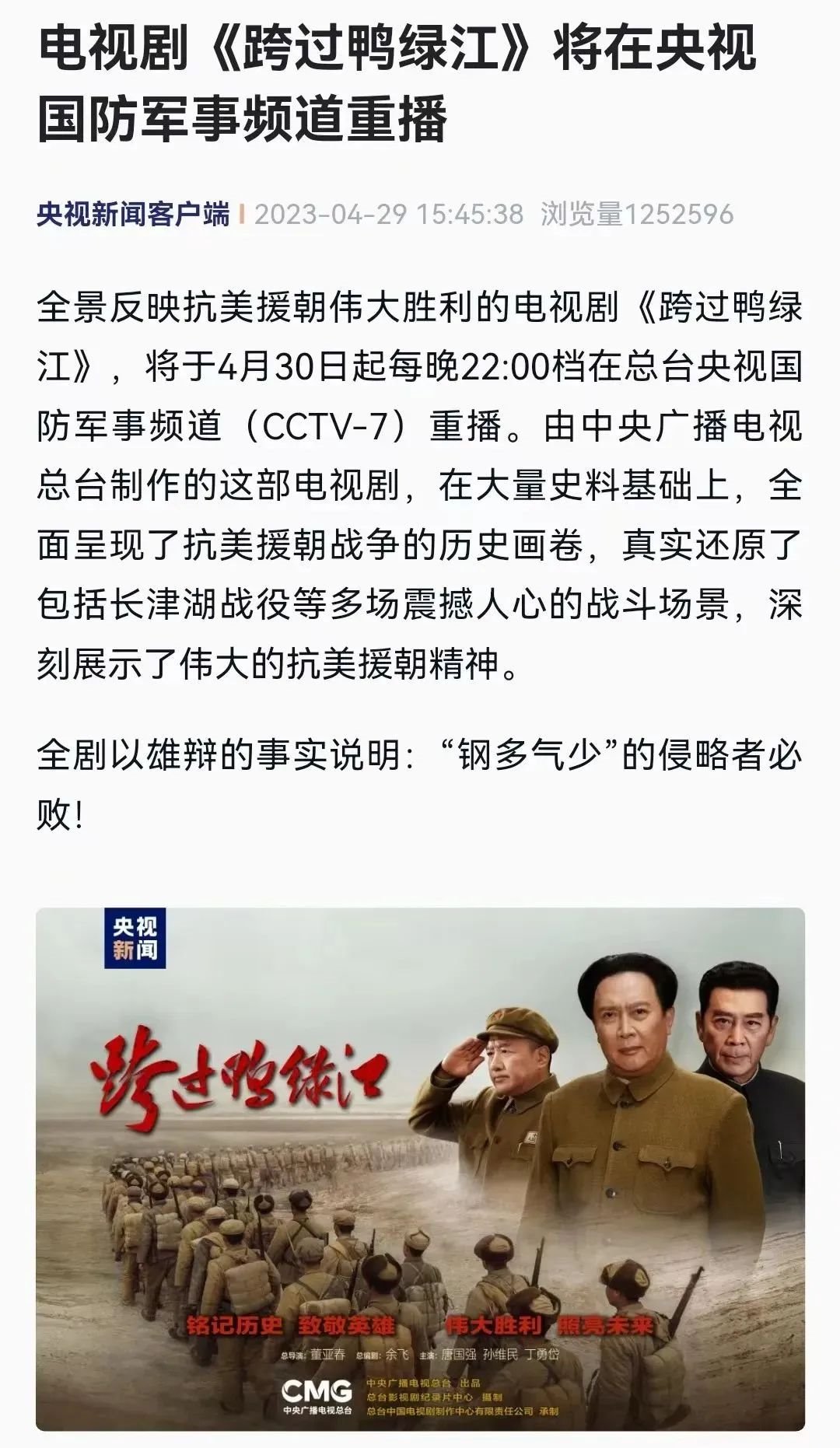 4月29日,中央廣播電視總臺(tái)發(fā)布預(yù)告:電視劇《跨過鴨綠江》自4月30日起每晚22點(diǎn)檔在央視國(guó)防軍事頻道重播。