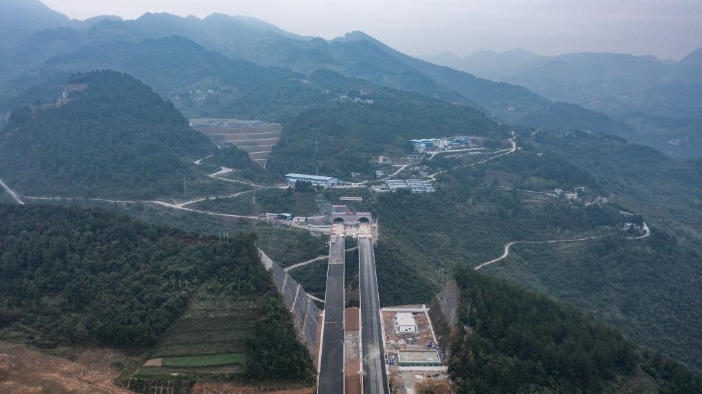 這是2022年10月13日拍攝的蘭州至??趪腋咚俟分貞c至遵義段(貴州境)擴容工程項目桐梓隧道。當日,桐梓隧道右幅順利貫通。新華社記者 陶亮 攝