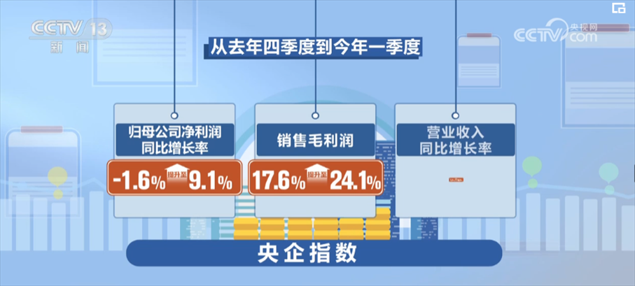 數(shù)據(jù)顯示,從去年四季度到今年一季度,央企指數(shù)歸母公司凈利潤同比增長率由-1.6%提升至9.1%,銷售毛利潤由17.6%提升至24.1%,營業(yè)收入同比增長率由1.1%提升至5.4%。相比去年四季度,各項(xiàng)財(cái)務(wù)指標(biāo)均有不同程度提高。