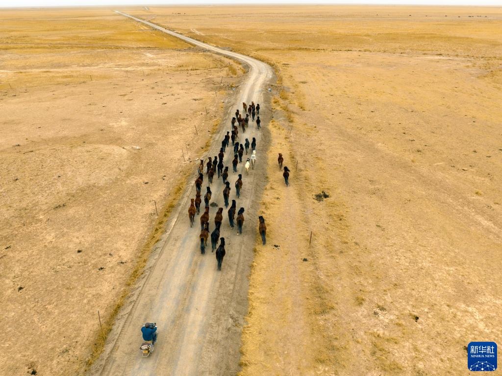 5月3日,在阿克塞縣阿伊納鄉(xiāng)海子草原,牧民趕著馬群進(jìn)行轉(zhuǎn)場(chǎng)(無(wú)人機(jī)照片)。