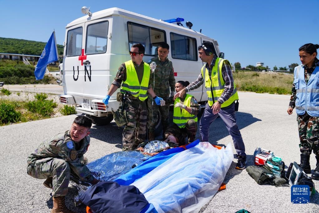 5月3日,在黎巴嫩南部邊境“藍(lán)線”附近雷場,參與演習(xí)的中國第21批赴黎巴嫩維和多功能工兵分隊隊員同外軍醫(yī)療分隊交接。