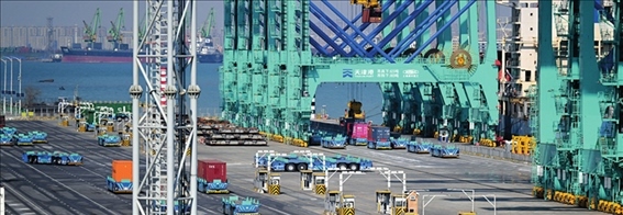 智能水平運輸機器人在天津港全物聯網集裝箱碼頭作業(yè)(2023 年2月21日攝)李然攝 / 本刊