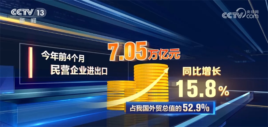 海關(guān)統(tǒng)計顯示,今年前4個月,民營企業(yè)進出口7.05萬億元,同比增長15.8%,占我國外貿(mào)總值的52.9%。