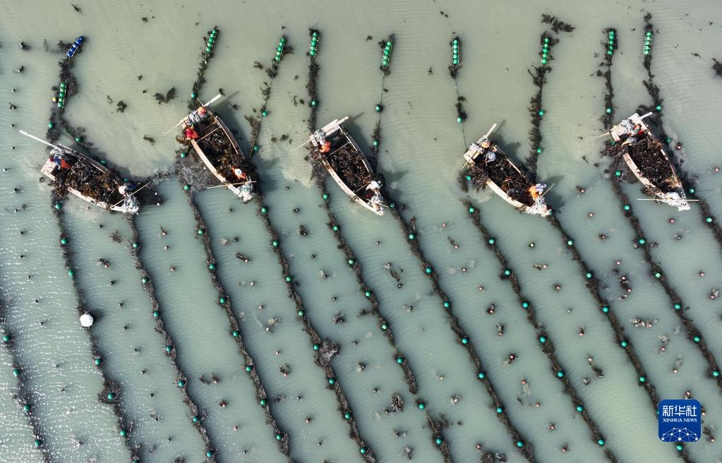 5月8日,在山東省榮成市愛倫灣海域海帶養(yǎng)殖區(qū),漁民采收海帶(無人機照片)。