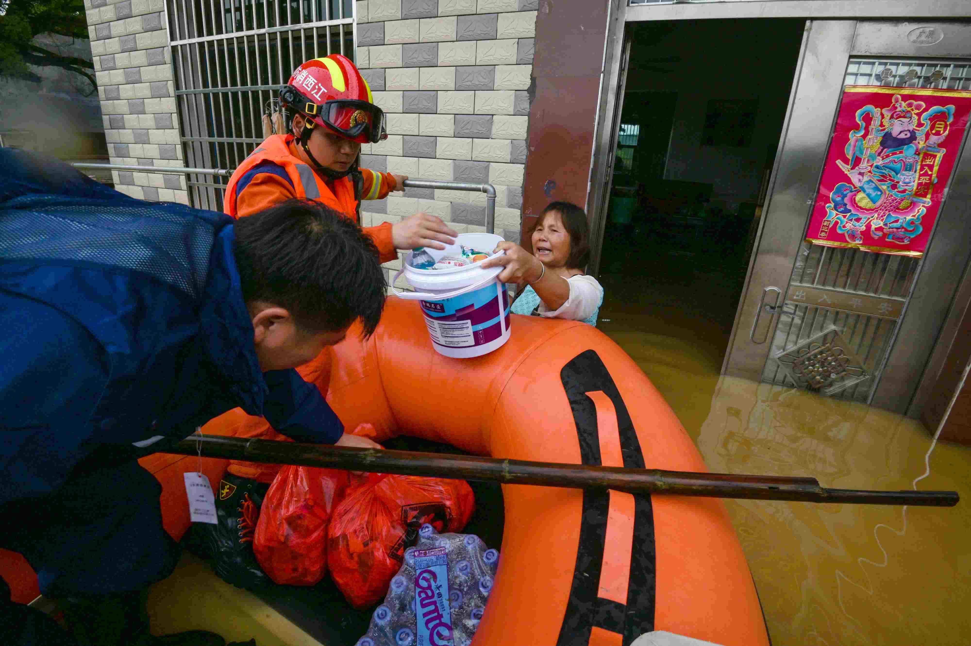 2023年5月6日,江西吉安,新干縣消防救援大隊隊員在麥斜鎮(zhèn)拿埠村給受困群眾運送生活物資。 視覺中國