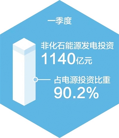非化石能源發(fā)電投資較快增長(zhǎng)。一季度,全國(guó)主要發(fā)電企業(yè)電源工程完成投資1264億元,同比增長(zhǎng)55.2%,其中非化石能源發(fā)電投資1140億元,同比增長(zhǎng)62.8%,占電源投資的比重達(dá)到90.2%。具體看,太陽能發(fā)電、核電、風(fēng)電投資同比分別增長(zhǎng)177.6%、53.5%、15%。