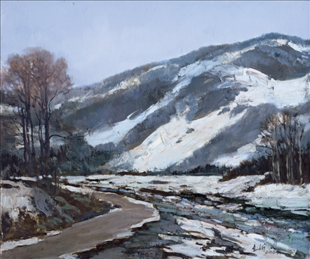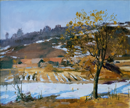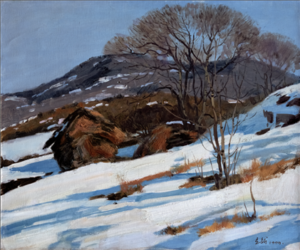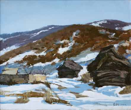 《激戰(zhàn)松骨峰》描繪的是抗美援朝戰(zhàn)爭(zhēng)中,中國(guó)人民志愿軍與美軍激烈廝殺的悲壯場(chǎng)面。作者從動(dòng)態(tài)型的構(gòu)圖與形象表層,把戰(zhàn)爭(zhēng)集團(tuán)之間的搏殺以濃重的筆調(diào)展現(xiàn)開(kāi)來(lái),表現(xiàn)了中國(guó)人民志愿軍英勇頑強(qiáng)、熱愛(ài)自由和勇于犧牲的精神,展示了歷史的悲劇性沖突。作者從沉甸甸的歷史中找到戰(zhàn)爭(zhēng)中最慘烈、最殘酷、最能表現(xiàn)人物悲劇性命運(yùn)的瞬間,用現(xiàn)實(shí)主義的創(chuàng)作手法,扎實(shí)、生動(dòng)地塑造了一個(gè)又一個(gè)志愿軍勇士的形象。硝煙籠罩著戰(zhàn)場(chǎng),鮮血與白雪融合成冰,敵我雙方,犬牙交錯(cuò),生死搏殺。同時(shí),也使我們感受到戰(zhàn)爭(zhēng)的殘酷與生命的脆弱。作者處理宏大的戰(zhàn)爭(zhēng)場(chǎng)面獨(dú)具匠心:陽(yáng)光透過(guò)硝煙,有節(jié)奏地營(yíng)造出戰(zhàn)場(chǎng)的空間;雪地上被間隔的藍(lán)色陰影,反襯出黃褐色的主調(diào)。作品對(duì)細(xì)部進(jìn)行了恰如其分的刻畫(huà),但又不失對(duì)整體宏觀的把握,厚重的色彩中透出熱情,樸拙的筆觸映著畫(huà)家的激動(dòng)。